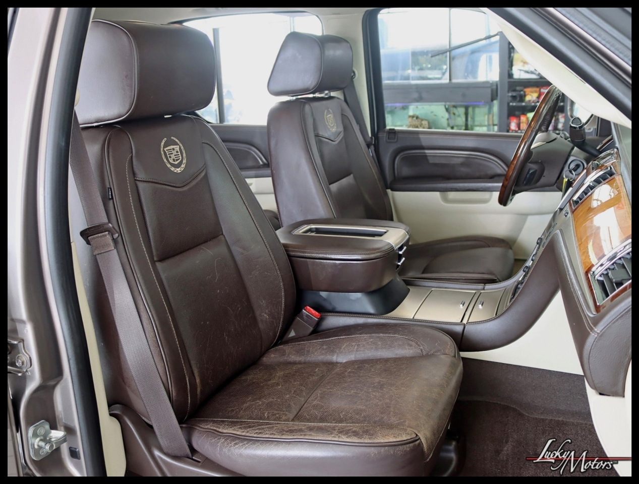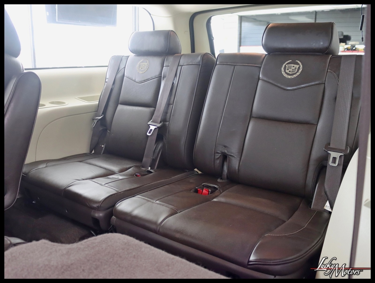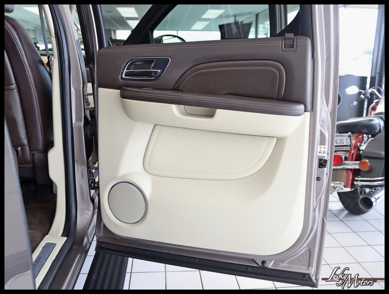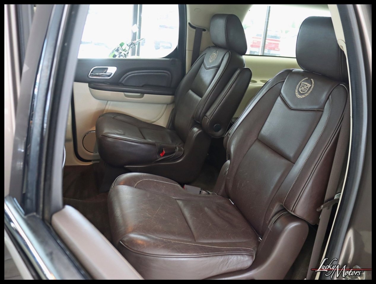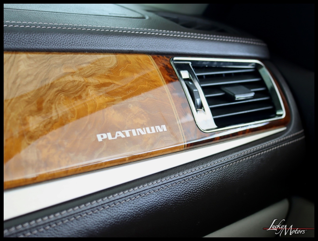 • Platinum includes unique upper and lower front grilles and fascia, (S85) unique 22 multi-spoke chrome wheels, (T4Q) LED headlamps, Cut-and-Sew leather-wrapped IP top pad and door uppers, vinyl-wrapped door lowers with contrasting-color French stitching, embroidered Cadillac insignias on front seats, genuine Olive Ash Burl and Walnut Burl woods with wood inlays and aluminum trimmed IP and console, unique console lid, (HNE) heated and cooled cup holders, chrome trim around HVAC vents, door handles and clock, full Aniline leather first and second row seats, full Nuance leather third row seat, (AYE) DVD screens located on backside of front row head restraints, (195) Ebony/Ebony interior or (415) Cocoa/Light Linen interior, unique door sills, unique floor mats, (TQ5) IntelliBeam headlamps, (UVD) heated steering wheel, (ARS) power release second row bucket seats, (BRS) power-retractable assist steps, (CF5) power sunroof, (UFT) Side Blind Zone Alert, (Z95) Magnetic Ride Control and (U42) overhead rear seat entertainment system